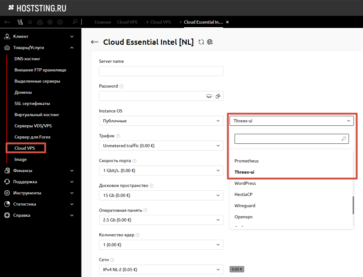 Разверните готовый сервер Treex-UI из образа. Для этого приобретите — любую услугу Cloud VPS. В биллинге личного кабинета выберите сборку Публичного инстанса с названием «Treex-UI».